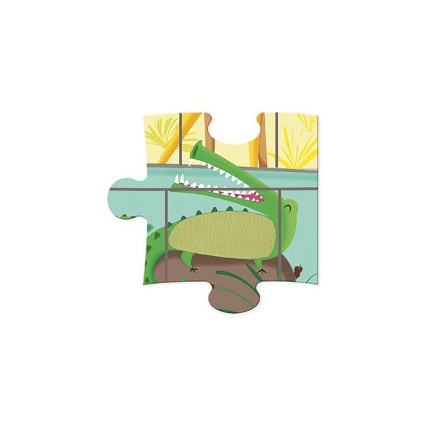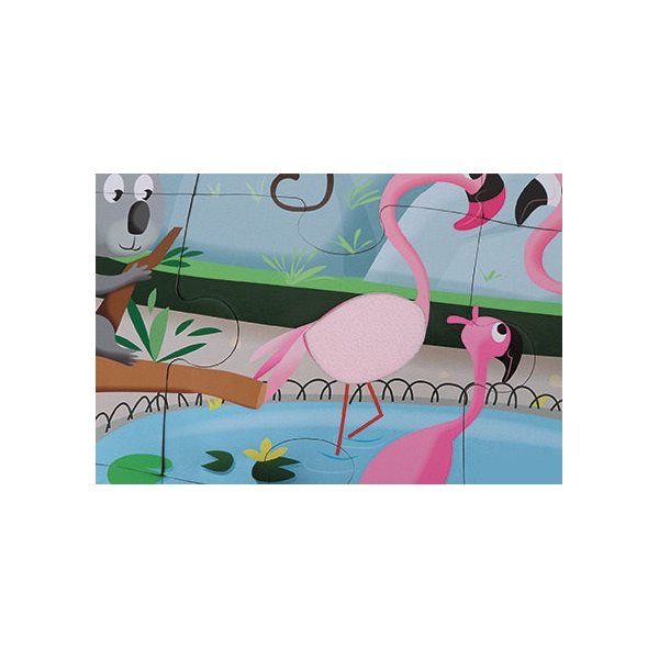 Puzzle doskonałe do zabawy i stymulowania dotyku oraz wzroku. Puzzle składają się z 20 elementów, które po złożeniu przedstawiają uroczy obrazek o wymiarach 65 cm x 50 cm. Obrazek przedstawia życie zwierząt w zoo. Dziecko ma możliwość poznać postacie sensorycznie - sierść czy skóra siedmiu zwierząt wykonane zostały z teksturowanych materiałów.