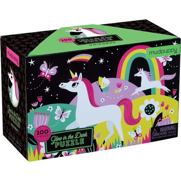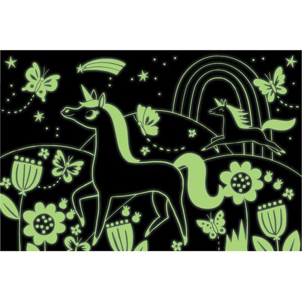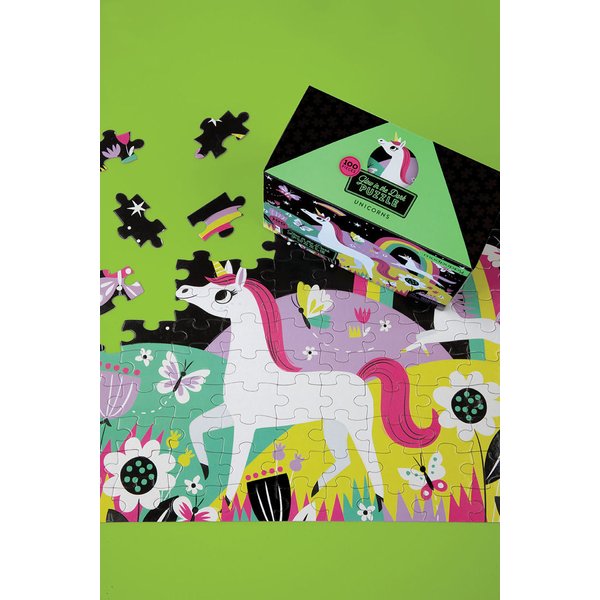 Puzzle posiadają 100 kawałków, które po złożeniu przedstawiają obrazek o wymiarach 46cm x 30,5cm. Całość ukazuje przepięknego jednorożca na tęczowej polanie - dodatkowo świecą w ciemności! Układanka została zapakowana w ładne pudełko idealne na prezent.