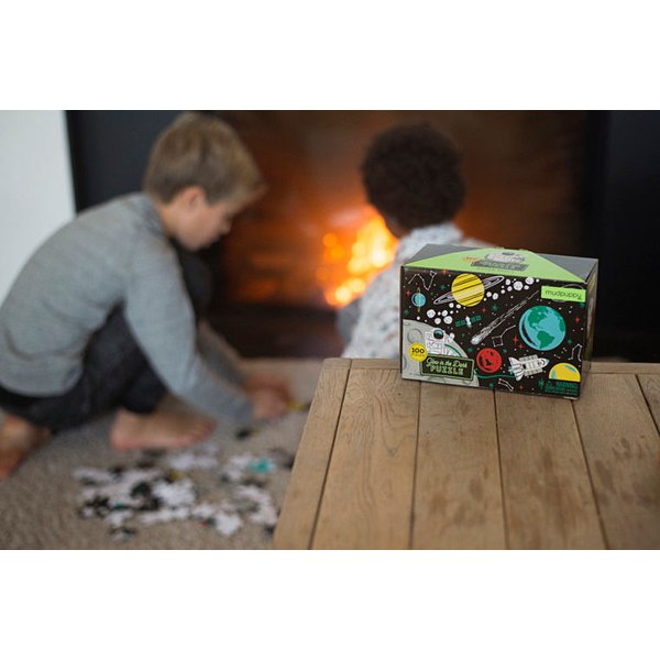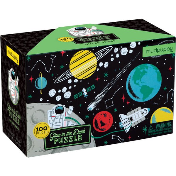 Puzzle posiadają 100 kawałków, które po złożeniu przedstawiają obrazek o wymiarach 46cm x 30,5cm. Całość ukazuje planety w kosmosie a nawet pracującego astronautę - dodatkowo świecą w ciemności! Układanka została zapakowana w ładne pudełko idealne na prezent.