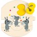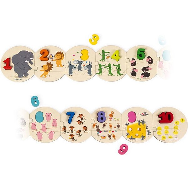 Puzzle posiadają 20 elementów w tym 10 okrągłych puzzli z grubego kartonu oraz 10 drewnianych przestrzennych cyfr. Grube puzzle należy łączyć ze sobą we właściwej kolejności, natomiast drewniane cyfry służą do umieszczania w odpowiednie wgłębienia na puzzlach. Elementy są kolorowo ilustrowane zwierzątkami takimi jak słonik, myszki czy osiołek.