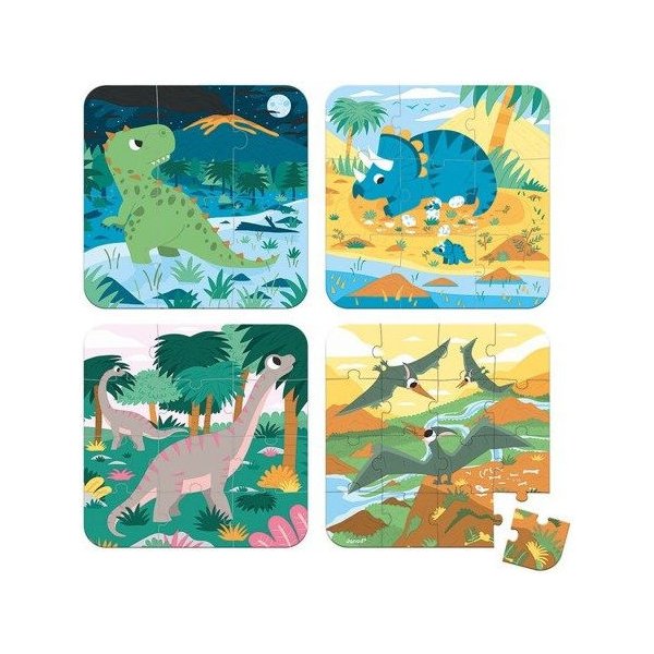 Zestaw puzzli od Janod to doskonały prezent dla dziecka, który zaczyna swoją przygodę z większą ilością elementów do układania. Składa się z 4 obrazków po 6, 9, 12 i 16 części co pozwoli na stopniowe rozszerzanie swoich umiejętności. Każda układanka przedstawia dinozaura w swoi naturalnym środowisku. Wykonane z solidnego kartonu i zapakowane w ozdobną walizeczkę idealnie nadadzą się na prezent.