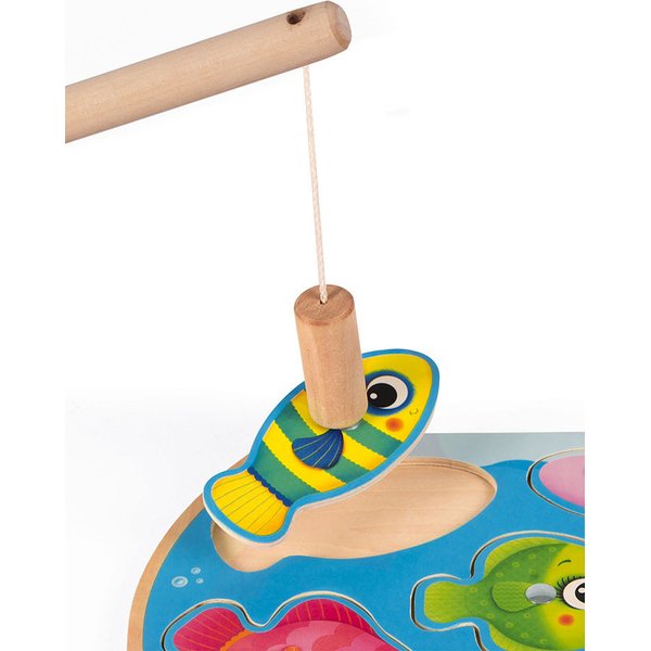 Puzzle Szybkie rybki to 6 drewnianych kolorowych rybek, które należy dopasować do otworów w drewnianej planszy, która ma kształt akwarium-kuli. Dodatkowo każda rybka wyposażona jest w magnes, który pozwala na łowienie rybek za pomocą drewnianej wędki (wędka dołączona do zestawu).