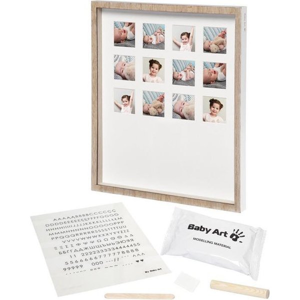 Z ramką na zdjęcia od Baby Art stworzymy niezwykłą pamiątkę z pierwszego roku życia naszego dziecka. Posiada ona miejsce na 12 zdjęć, w których można umieścić zdjęcia z każdego miesiąca, pierwszego roku życia malucha. Dodatkowo można wykonać również odcisk rączki lub stópki co doda jeszcze większego uroku ramce. Do zestawu dołączone są wszystkie materiały do jego wykonania. Aby spersonalizować ozdobę jeszcze bardziej, zestaw zawiera również szablon z literkami z których możemy ułożyć imię dziecka wraz z datą urodzenia.
