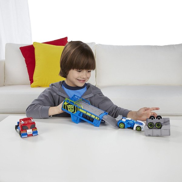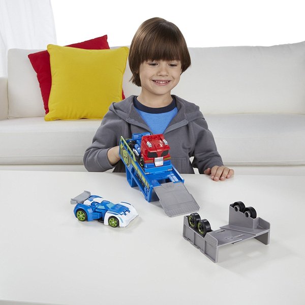 Teraz zestaw dwóch Transformersów Optimusa Prime oraz Blurr'a, którzy szykują się na wyścig. W zestawie naczepa, na której Optimus dowiezie na tor robota. W każdej chwili możesz również przemienić naczepę na super szybką zjeżdżalnię - ale frajda!