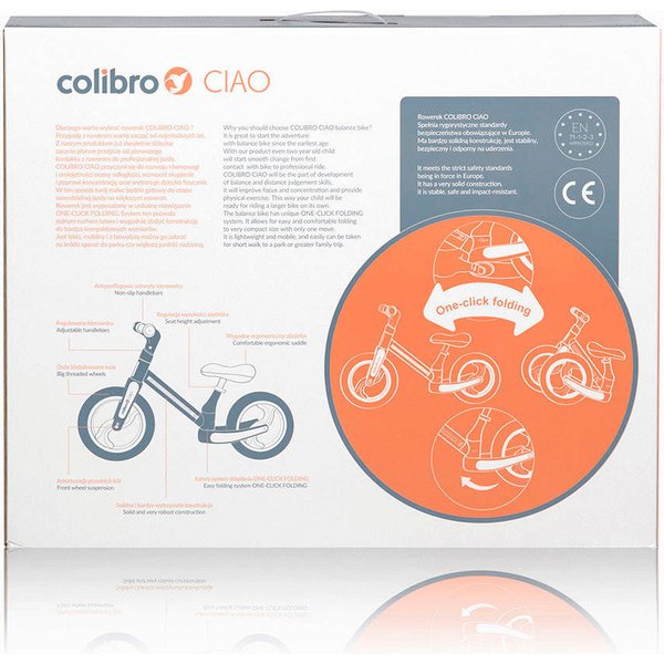 Stabilna konstrukcja modelu Ciao została wyposażona w system szybkiego składania One Click, pozwalający w mgnieniu oka na złożenie rowerka i schowanie go w plecaku. Małe gabaryty i niewielka waga to jego dodatkowe atuty. Rowerek posiada komfortowe, piankowe siodełko z regulacją wysokości, kierownicę z antypoślizgowymi uchwytami, którą także łatwo dopasujesz do wzrostu Twojego dziecka oraz amortyzowane koło przednie. Jazda po wertepach parkowych alejek nie będzie przykrym doświadczeniem, co zachęci malucha do dłuższej aktywności fizycznej.