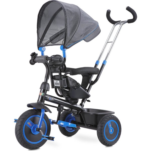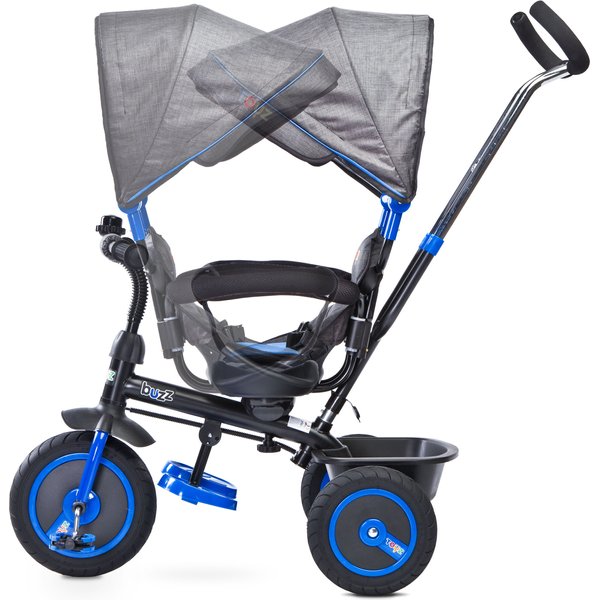 Rowerek Buzz daje więcej możliwości niż tradycyjny rowerek trójkołowy, został wyposażony w obrotowe siedzisko. Obrót możliwy jest o 180 stopni, dzięki czemu możemy nasze dziecko ustawić twarzą do nas samych. Siedzenie posiada oparcie oraz barierkę wraz z pasami, zabezpieczające dziecko przed wypadnięciem. Do siedziska dołączony został składany daszek oraz rączka do prowadzenia, dająca możliwość wykorzystania rowerka jako wózek spacerowy. Daszek dobrze sprawdzi się jako ochrona przed promieniami UV w pełni słoneczne dni. Poniżej siedzenia nasz maluch może śmiało ułożyć swoje nóżki na kładkach, przypominających pedały. Między tylnymi kołami, znajduje się koszyk, który od ciąży nas z noszenia niewielkiej torby z zakupami, bądź zabawek od naszego malucha. Komfort, dobrą przyczepność oraz amortyzację na każdej nawierzchni zapewniają piankowe koła, na które nałożono grube, gumowe opony.