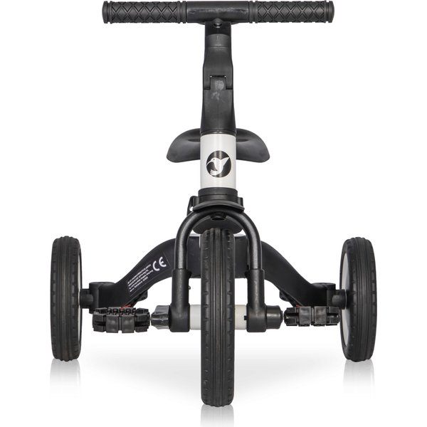- Dla najmłodszych bo od 1 do 2 roku życia wykorzystać go możemy jako jeździk trójkołowy. Ta konfiguracja jest pozbawiona pedałów, a siedzisko ustawione najniżej. Posiada jedno kółko z tyłu oraz dwa rozstawione szeroko kółka, które gwarantują odpowiednią stabilność. Maluch może swobodnie odpychać się i uczyć jazdy oraz poczucia równowagi.