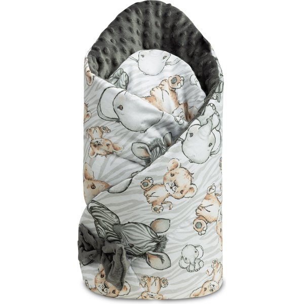 Wykonany z najwyższej jakości bawełny oraz tkaniny typu minky produkt zagwarantuje maluszkowi pełen komfort i wygodę. Jest on wypełniony puszystą włókniną, która utrzyma temperaturę dziecka, a jednocześnie nie przegrzeje. Rożek znajdzie swoje zastosowanie jako kołderka czy śpiworek w wózeczku, a rozłożony jako podkład czy mata. Zapinany jest na rzep. Dwustronny rożek posiada wesoły nadruk i stanie się ozdobą dziecięcego pokoiku.