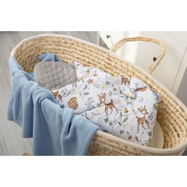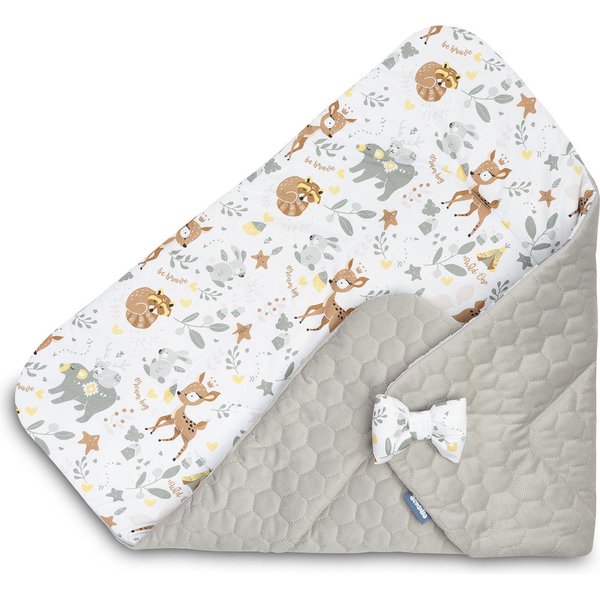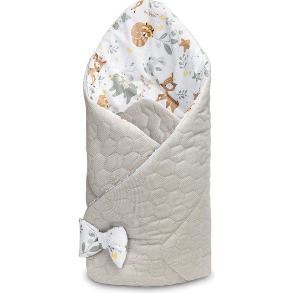 Dwustronny, mięciutki rożek dla niemowląt wykonany z najwyższej jakości 100% bawełny. Posiada piękny nadruk, a z drugiej strony pikowany materiał z tkaniny velvet. Zagwarantuje maluszkowi pełen komfort i wygodę. Wypełniony puszystą włókniną utrzyma temperaturę dziecka, a jednocześnie nie przegrzeje go. Produkt znajdzie swoje zastosowanie jako kołderka czy śpiworek w wózeczku, a rozłożony jako podkład czy mata. Rożek zapinany jest na rzep.