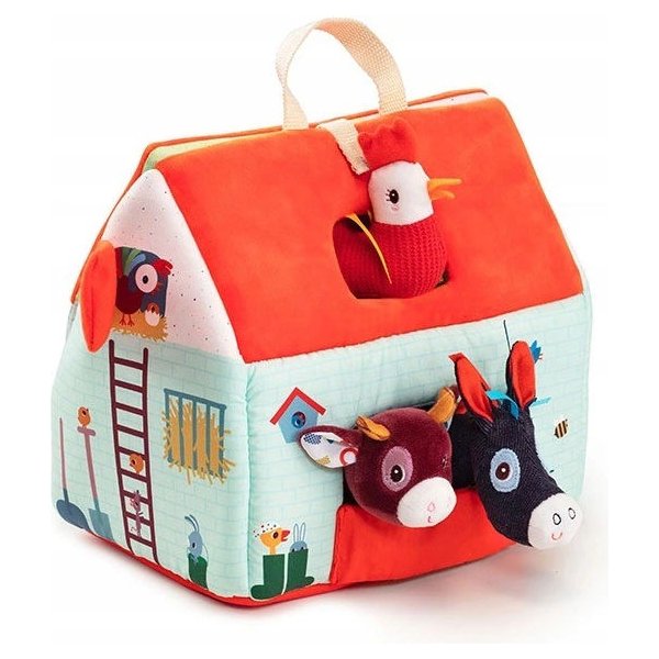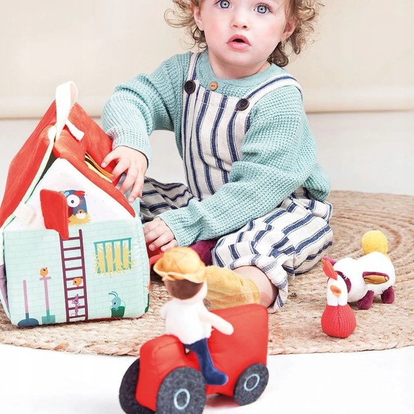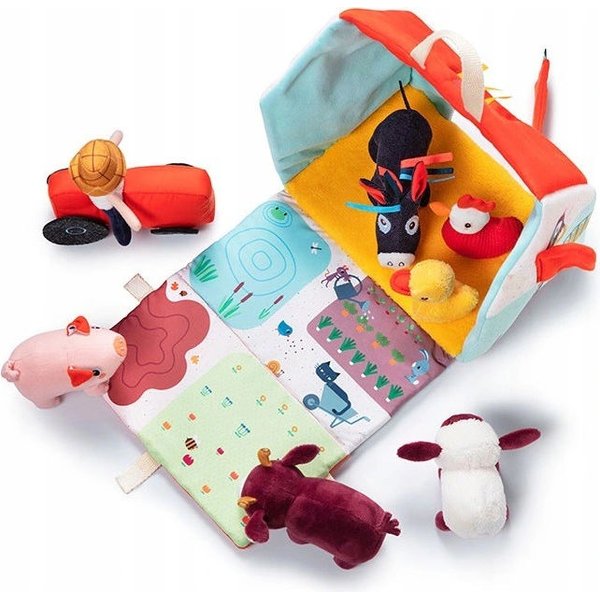 Urocza farma wykonana z miękkiego materiału! Zachwyci nie tylko wyglądem, ale również wyposażeniem jakie wchodzi w skład zestawu. Maluch oprócz domku będzie miał do dyspozycji 6 pluszowych zwierzątek oraz rolnika z traktorem. Dziecko będzie mógł, więc przyswoić sobie jak wygląda krówka, świnka, owieczka, kaczor, kokoszka i osiołek. Różnorodne faktury będą mogły pobudzić dotyk, a całość rozwinie wyobraźnię oraz kreatywność. Domek posiada otwierany jeden bok. To ułatwi przechowywanie figurek wewnątrz co pozwoli zachować porządek po skończonej zabawie. Druga ściana wyposażona została w otwarte okno przez, które wyglądać mogą zwierzątka. Wszystkie ruchome elementy posiadają rzep. Zabawka posiada również uchwyt do przenoszenia, który ułatwi transport. Kolorowe ilustracje zachęcają do zabawy, która pozwoli rozwinąć zdolności motoryczne.