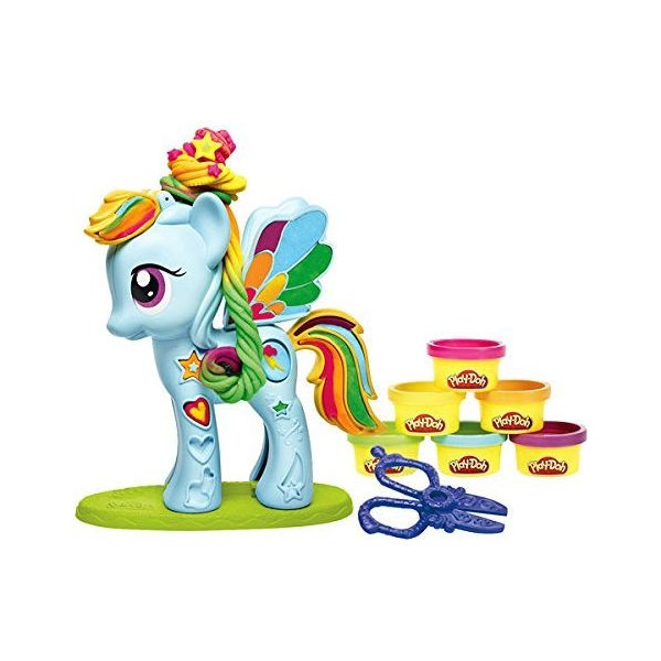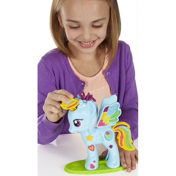 Salon fryzjerski Rainbow Dash to zestaw, który pozwoli tworzyć wspaniałego kucyka w różnych odsłonach.Dzięki dołączonym akcesoriom i kolorowej ciastolinie można ozdabiać kucyka na różne sposoby, codziennie może wyglądać inaczej. Kucyk ma plastikową grzywkę, która służy do wyciskania ciastoliny, dzięki której można stworzyć kucykowi długą grzywę w różnych kolorach.