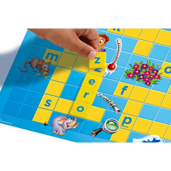 Słowa i obrazki: młodsze dzieci, bawiąc się, łączą litery na planszy, a obrazki pomagają wymyślać słowa.