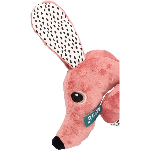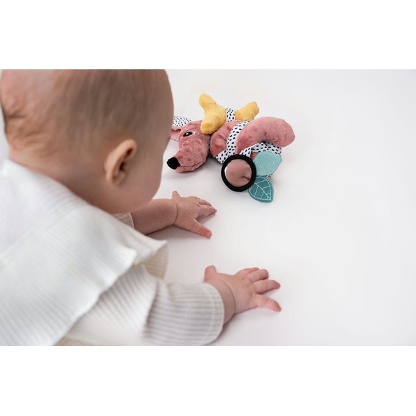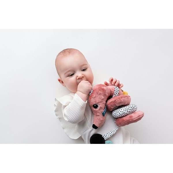 Wózek, fotelik, stojak a może łóżeczko - gdziekolwiek chcesz, tam znajdzie się miejsce dla kontrastowej spiralki. Uszyta z przyjemnych w dotyku materiałów zabawka kryje w sobie mnóstwo budzących ciekawość maluszka elementów: grzechotki, bezpieczne lusterko, wystające metki i kółko. Działają one na wszystkie zmysły maluszka i inspirują do ćwiczeń motorycznych - chwytania, pociągania, ściskania, poruszania itd. Maluszek może także przytulać się do mięciutkiej zabawki - uroczego jamniczka.