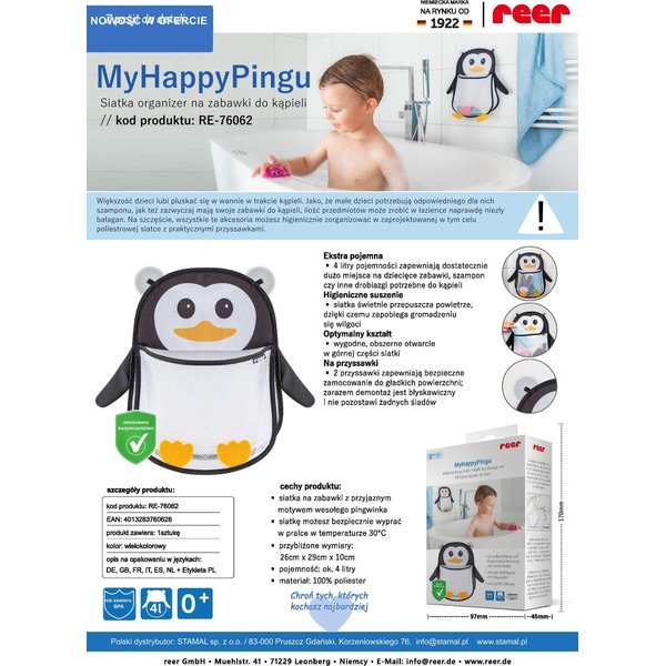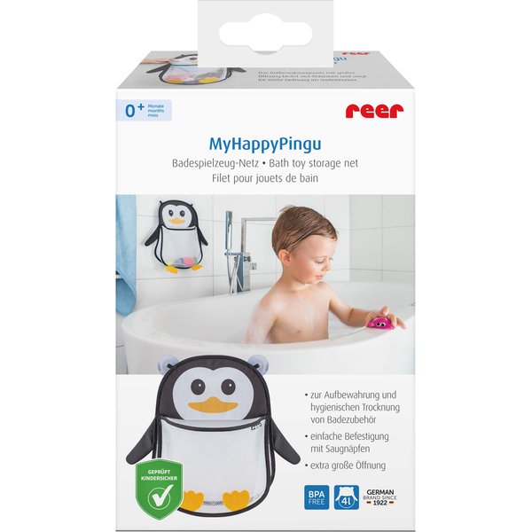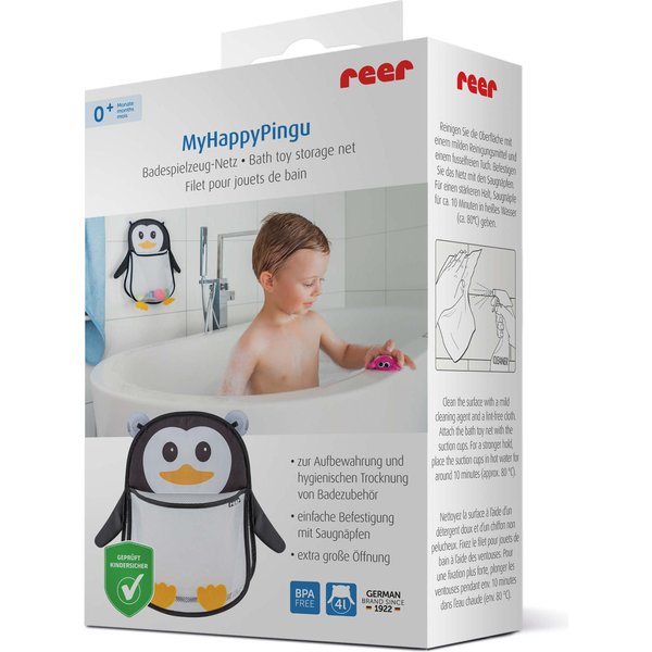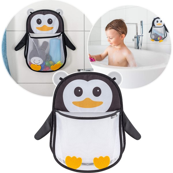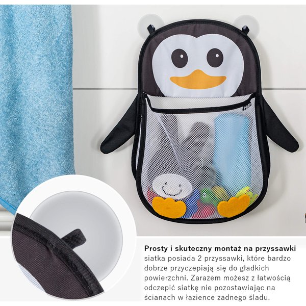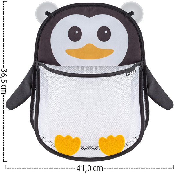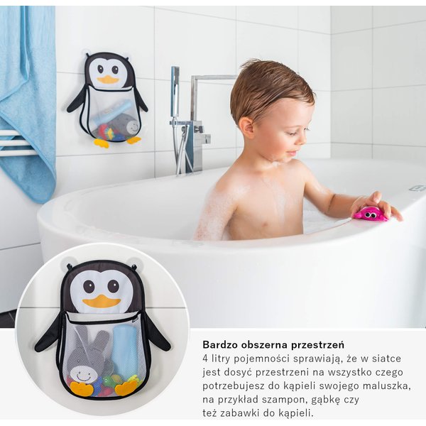 Siatka organizer do łazienki na zabawki do kąpieli Pingwin marki Reer pomoże uporządkować zabawkowy bałagan w łazience.