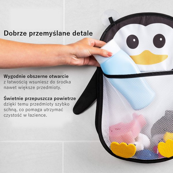 Model ten to doskonały sposób na przechowywanie zabawek do kąpieli. Wykonany z wytrzymałego poliestru Pingwinek pomieści w sobie ulubione zabawki Twojej pociechy. Łatwo go zamocujesz za pomocą przyssawek do kafelek. Możesz go wyprać w pralce, aby zawsze był higienicznie czysty. Siatkowy materiał umożliwia szybkie wysychanie zabawek, co zapobiega tworzeniu się pleśni i powstawaniu nieprzyjemnego zapachu. Szeroki otwór sprawia, że szybko i łatwo wyciągniesz każdą zabawkę.
