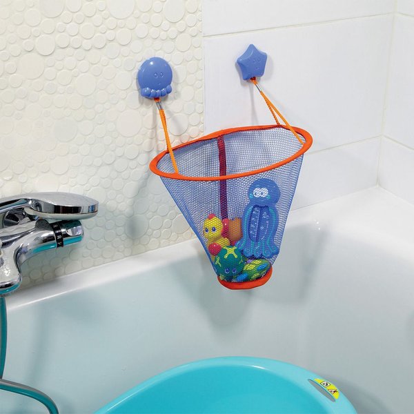 Dla dziecka posłuży jako świetna zabawa np. rzucanie do kosza gumowe zabawki. Dla rodzica będzie pomocne w utrzymaniu porządku w łazience. Kosz montuje się na ścianie za pomocą przyssawek, a w środku można umieścić wszystkie zabawki kąpielowe malucha. Siatka umożliwia odpływ wody, zabawki bez problemu mogą wyschnąć i czekać na następną kąpiel.