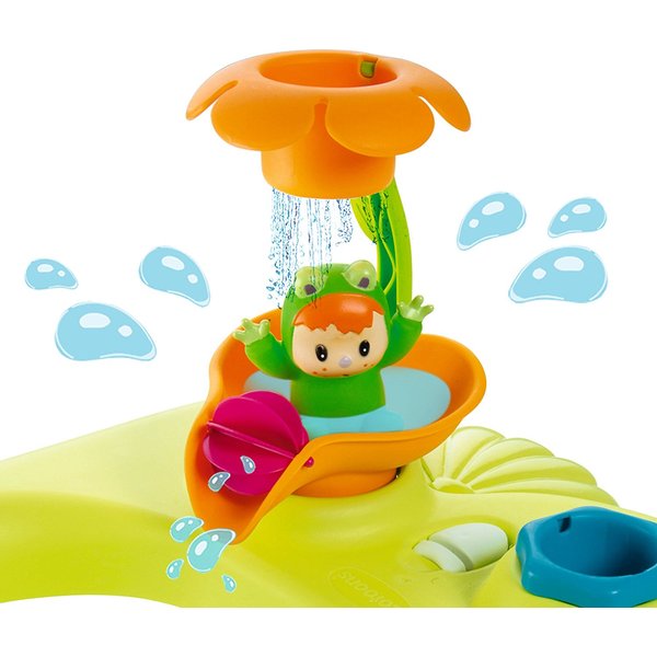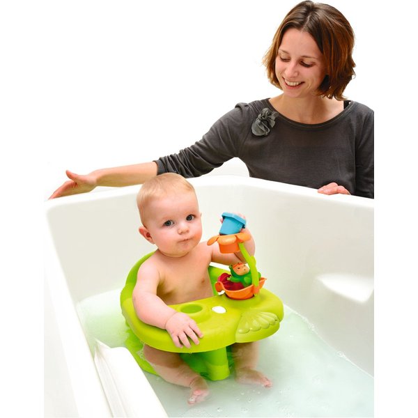 Dzięki tacce z zabawkami maluszek pokocha kąpiele w foteliku! Jest tutaj prysznic w kształcie kwiatka, kubeczek do zabawy w wodzie oraz gumowa figurka żabki, która po napełnieni psika wodą - ale frajda!