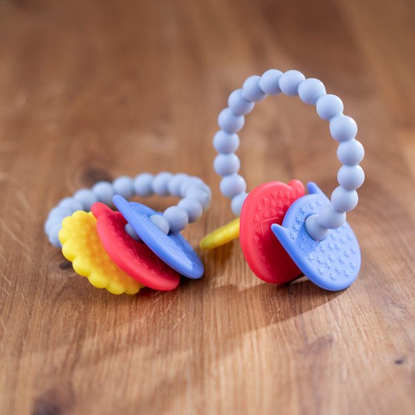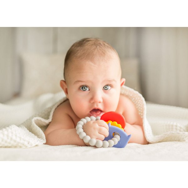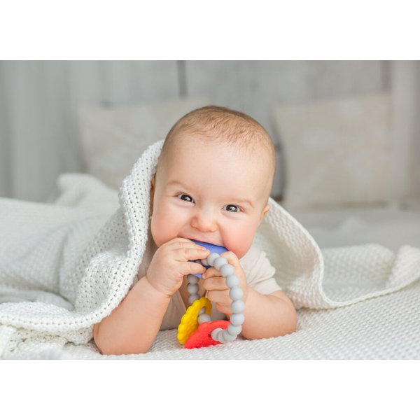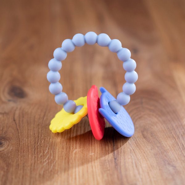 Silikonowy gryzaczek w formie bransoletki, który będzie zawsze przy maluszku! To taka pożyteczna biżuteria dla niemowlaka! Wyposażony został w trzy zawieszki, a każda z nich posiada inny kształt, kolor oraz fakturę. Delikatne wypustki pozwolą wymasować dziąsełka, co w momencie ząbkowania pozwoli załagodzić ból. Dzięki temu maluszek będzie spokojniejszy. Gryzak wykonany został z miękkich materiałów, dzięki czemu jest odporny na zgniatanie.