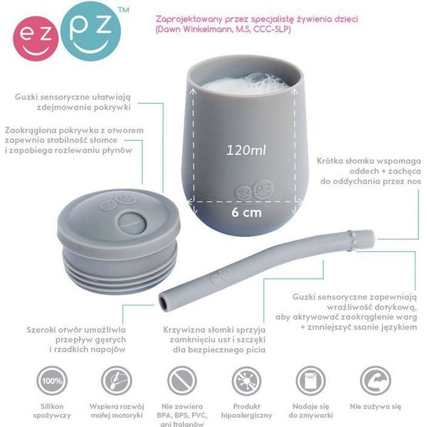 Silikonowy kubeczek ze słomką Mini Cup 120ml marki EZPZ to kolejny krok na drodze Twojego maluszka do nauki samodzielnego picia większych ilości płynów.