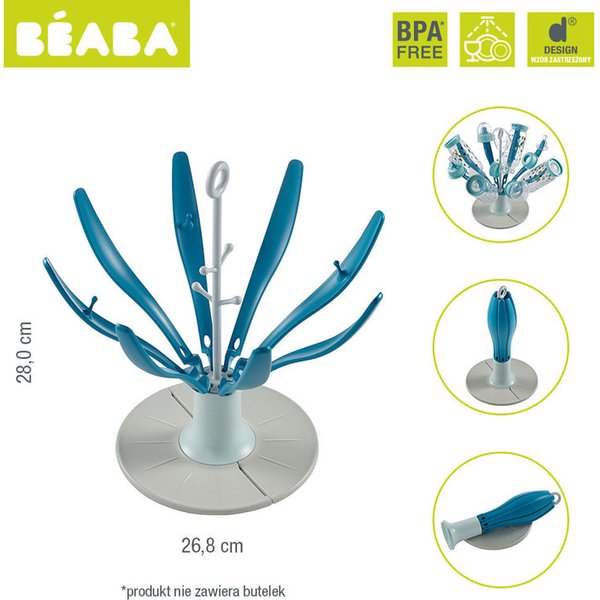 Przenośna i składana suszarka na butelki i akcesoria dla dzieci. Bardzo pojemna, zmieści około 8 butelek oraz dodatkowe akcesoria takie jak smoczki, nakrętki, czy przykrywki. Jej ergonomiczny kształt zagwarantuje szybkie schnięcie, a spływająca wodę do tacki łatwo wylejemy, dzięki możliwości jej odczepienia. Lekka, poręczna i łatwa do utrzymania w czystości, każdy element można zdementować, dzięki czemu możemy ją umyć ręcznie lub przy pomocy zmywarki. Wykonana z wysokiej jakości, bezpiecznego surowca, a jej designerski wygląd wpasuje się w nowoczesne wnętrza.