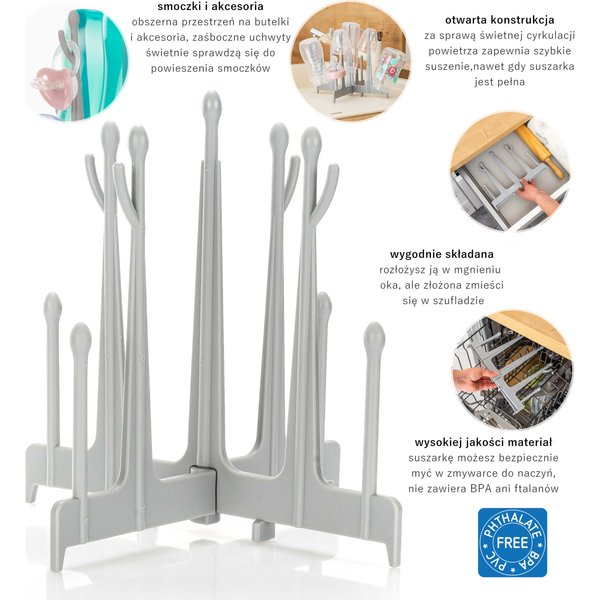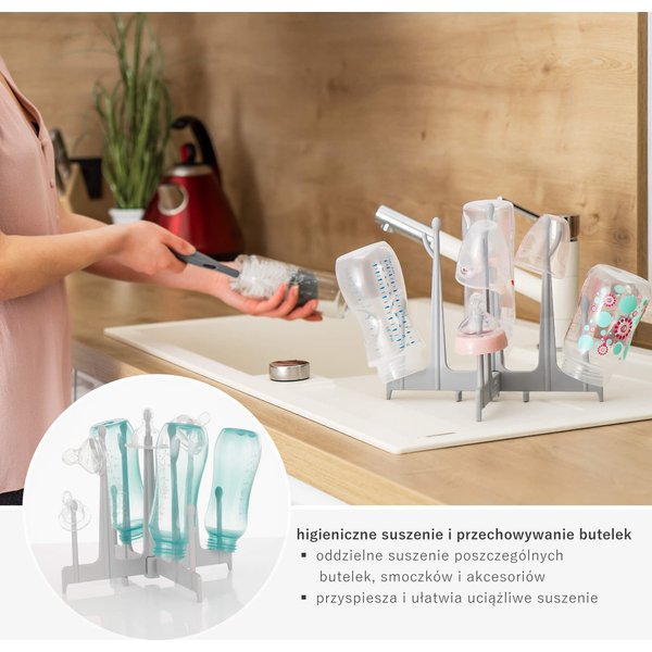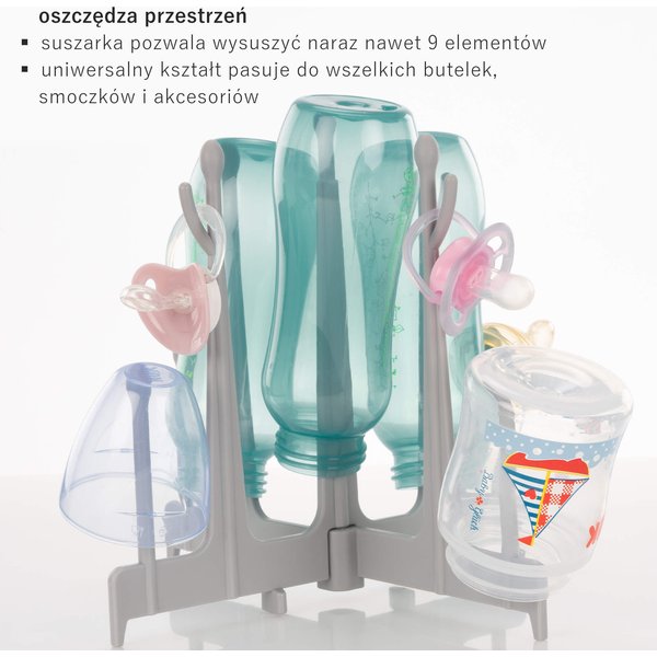 Wykonana z wytrzymałego i w pełni bezpiecznego plastiku suszarka ułatwia wysychanie butelek, smoczków i elementów laktatora. Dzięki czterem nóżkom suszarka skutecznie odseparuje butelki od blatu kuchennego, który nie zawsze jest sterylnie czysty. Jej przemyślany kształt z 9 ramionami sprawia, że butelki nie stykają się ze sobą, co przyspiesza ich wysychanie. Model ten jest kompatybilny ze wszystkimi butelkami dostępnymi na rynku. W razie potrzeby możesz ją złożyć, aby zajmowała mało miejsca. Z pewnością docenisz także możliwość mycia w zmywarce.