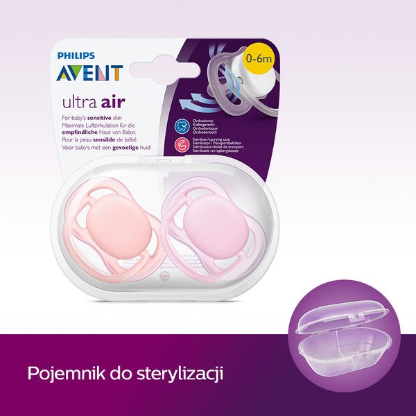 Nowy, ortodontyczny smoczek zapewniający maksymalną wygodę i bezpieczeństwo Twojemu dziecku. Nowa seria Ultra AIR oferuje smoczki z bardzo dużymi otworami na tarczy, które zapewniają doskonały przepływ powietrza i zapobiegają przy tym otarciom delikatnej skóry dziecka. W zestawie etui do sterylizacji w mikrofalówce! Teraz możesz szybko i łatwo zadbać o dokładną higienę smoczków dla twojej pociechy. Wlej wodę do etui i umieść w nim smoczki, teraz włóż do mikrofalówki na około 3 minuty - gotowe!