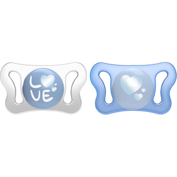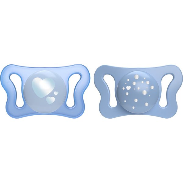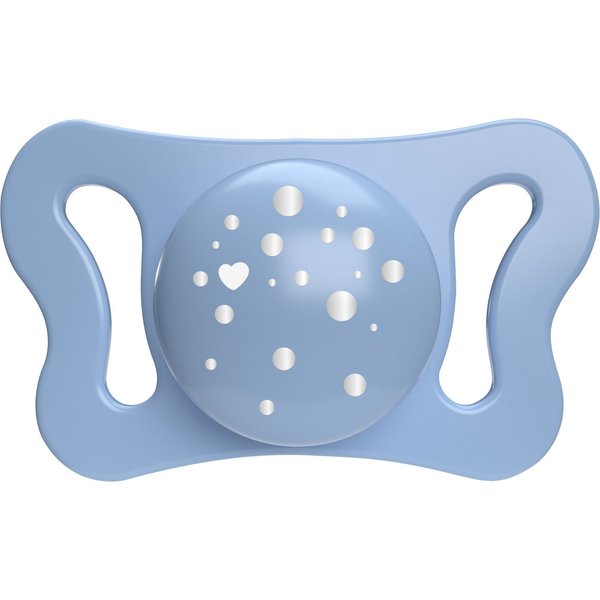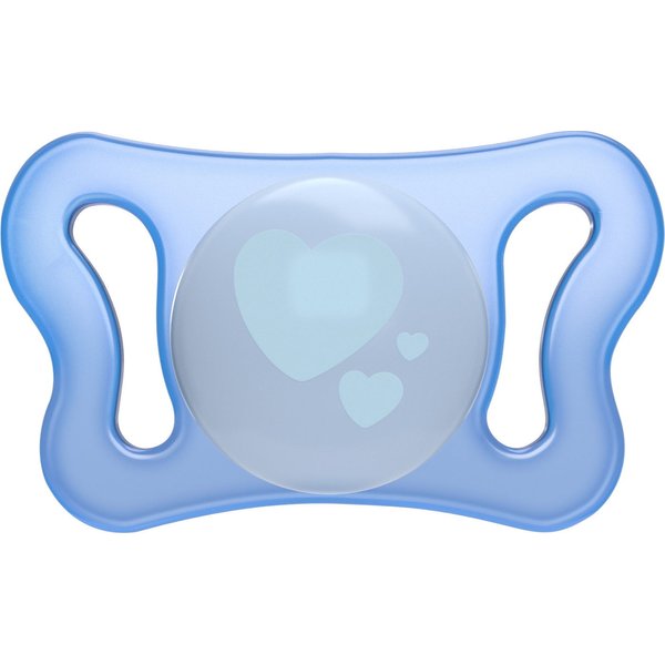 Jego ergonomiczny kształt sprawia, że pozostaje wystarczająco dużo miejsca na brodę i nos. Obecność sporych otworów wentylacyjnych usprawnia przepływ powietrza. Smoczek posiada malutką końcówkę silikonową, wyjątkowo aksamitną w dotyku, której kształt nie zaburza prawidłowego rozwoju jamy ustnej, odpowiedniego ułożenia języka (do przodu) oraz oddychania. Jest ona miękka, ale jednocześnie odporna na uszkodzenia. W komplecie ze smoczkami znajdziesz jeszcze etui do ich przechowywania i sterylizacji.