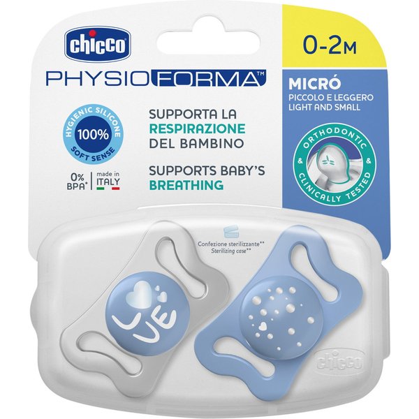 Model Physioforma Micro marki Chicco to super lekki smoczek w najmniejszym rozmiarze, który sprawdzi się jako uspokajacz dla wcześniaków i noworodków z małą masą urodzeniową.