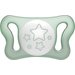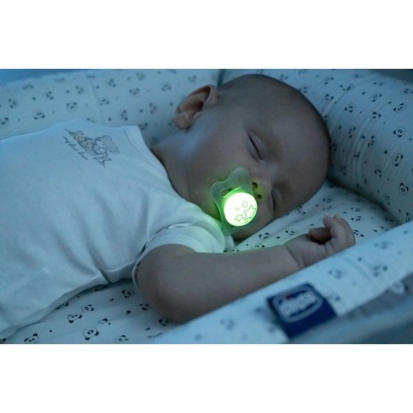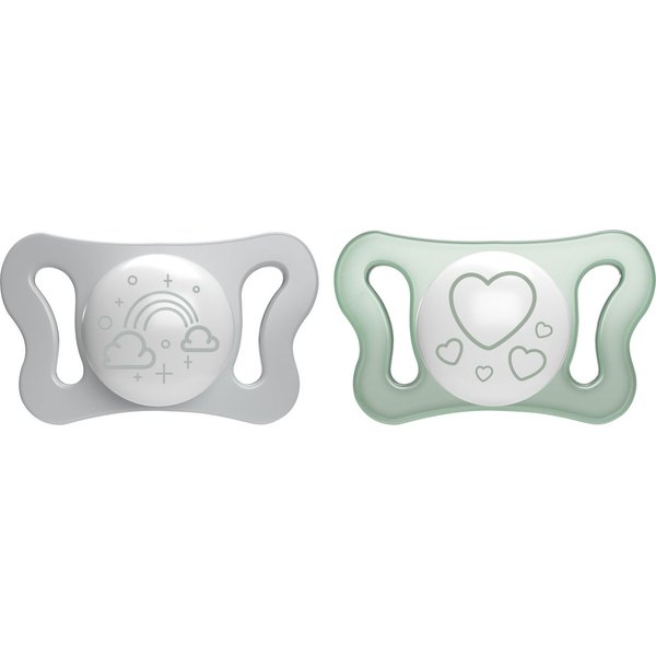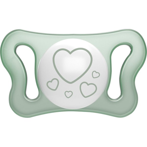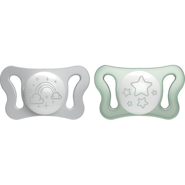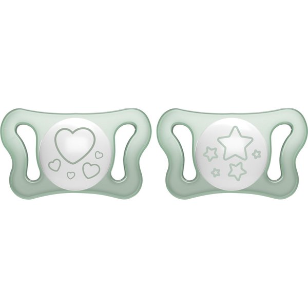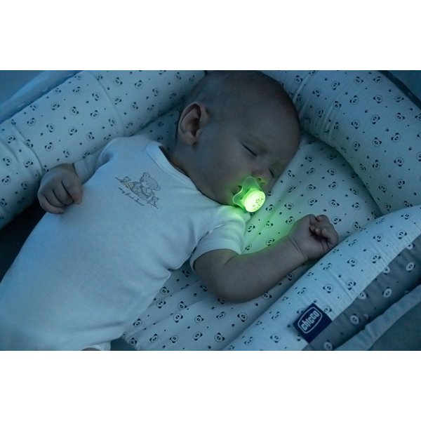 Jego ergonomiczny kształt sprawia, że pozostaje wystarczająco dużo miejsca na brodę i nos. Obecność sporych otworów wentylacyjnych usprawnia przepływ powietrza. Smoczek posiada malutką końcówkę silikonową, wyjątkowo aksamitną w dotyku, której kształt nie zaburza prawidłowego rozwoju jamy ustnej, odpowiedniego ułożenia języka (do przodu) oraz oddychania. Jest ona miękka, ale jednocześnie odporna na uszkodzenia. Dużą zaletą smoczka jest funkcja świecenia w ciemności - teraz łatwo znajdziesz smoczek w łóżeczku maluszka lub na stoliku.