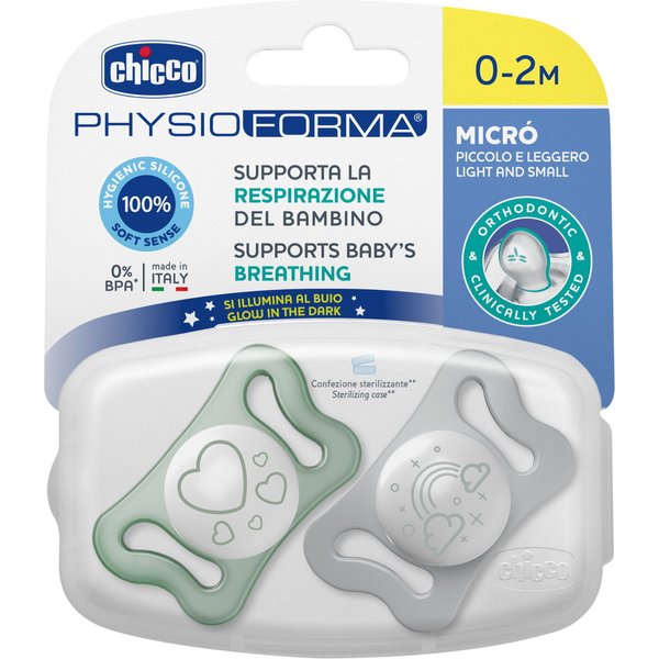 Model Physioforma Micro marki Chicco to super lekki smoczek w najmniejszym rozmiarze, który sprawdzi się jako uspokajacz dla wcześniaków i noworodków z małą masą urodzeniową.
