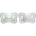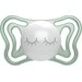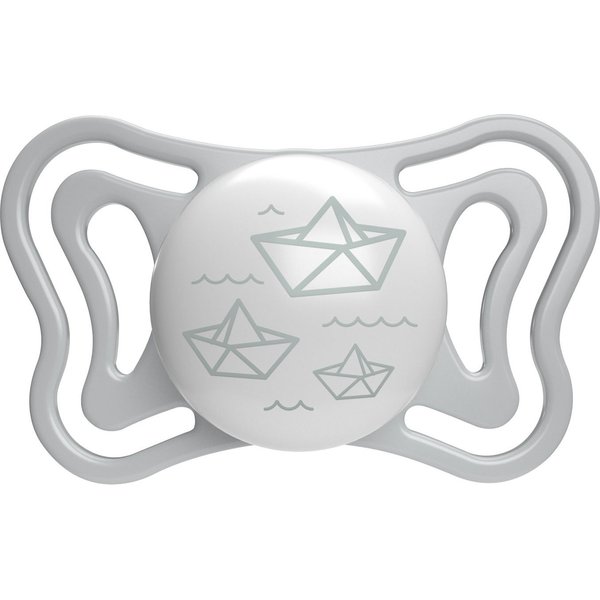 Tarczka smoczka posiada ergonomiczny kształt, dzięki czemu na nosek i brodę pozostaje sporo miejsca. Duże otwory wentylacyjne zapobiegają powstawaniu otarć i nadmiernemu poceniu. Końcówka została wykonana z jedwabiście gładkiego silikonu Soft Sense, przypominającego pierś mamy. Jej kształt jest całkowicie bezpieczny dla rozwoju jamy ustnej i uzębienia. Język maluszka przyjmuje zawsze prawidłową pozycję, a oddychanie nie jest niczym utrudnione.
