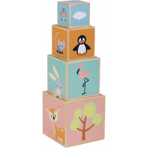 Sorter drewniane kostki 4 szt od Sun Baby z wyjmowanymi elementami to prosta zabawka, wykonana z całkowicie bezpiecznych dla dziecka materiałów, która sprawdzi się podczas zabawy w układanie wieży lub innych prostych konstrukcji.