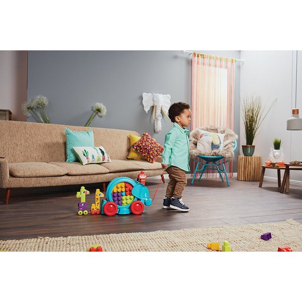 W zestawie: 25 elementów do tworzenia budowli oraz słonik do ciągnięcia