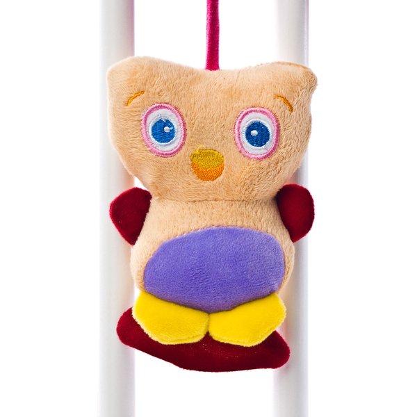Wiszące elementy w intensywnych kolorach będą przyciągać uwagę dziecka. Maluszek odkryje tu grzechotkę, szeleszczące elementy oraz mięciutką sówkę do pociągania i trącani.