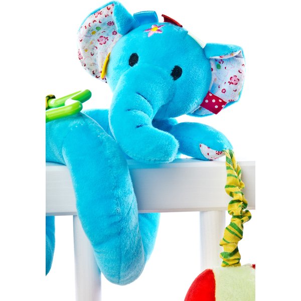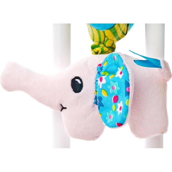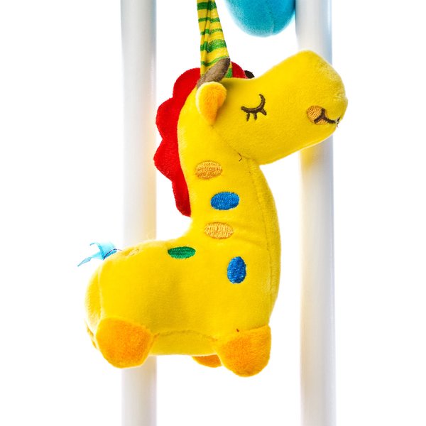 Wiszące elementy w intensywnych kolorach będą przyciągać uwagę dziecka. Maluszek odkryje tu grzechotkę, wibrującego słonika oraz mięciutką żyrafkę do pociągania i trącani.