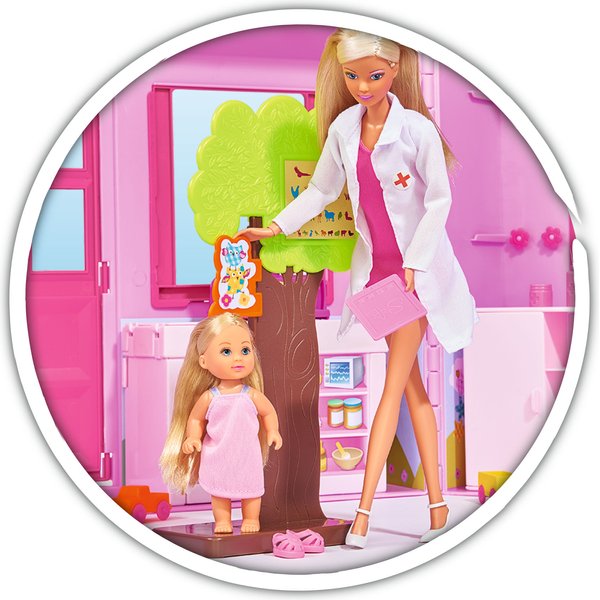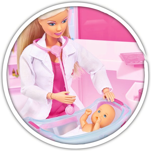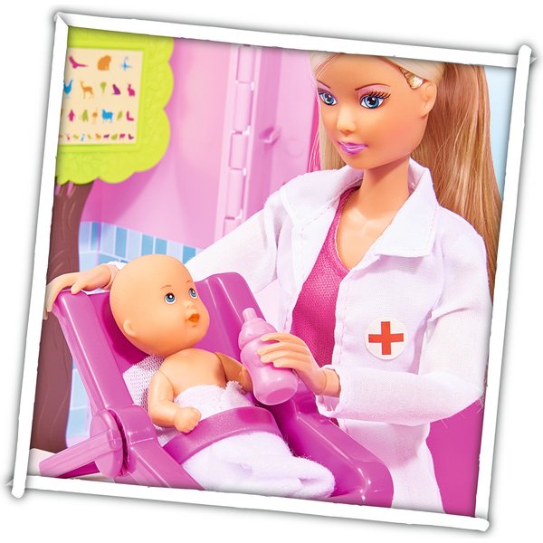 Steffi wciela się w lekarza! Zaopiekuj się małymi dziećmi w prywatnym gabinecie Steffi, jest tutaj dużo akcesoriów które pomogą Ci zaoferować perfekcyjną opiekę tym maluchom takie jak, butelki do karmienia, stetoskop, wanienka, łóżeczko i wiele innych. Łącznie aż 30 elementów do zabawy!