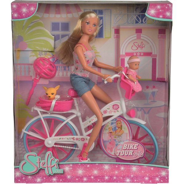 Steffi została mamą! Wybierz się wraz z nią i bobaskiem na przejażdżkę rowerem. Rower został wyposażony w fotelik dla maluszka oraz koszyczek dla pieska - ale frajda!
