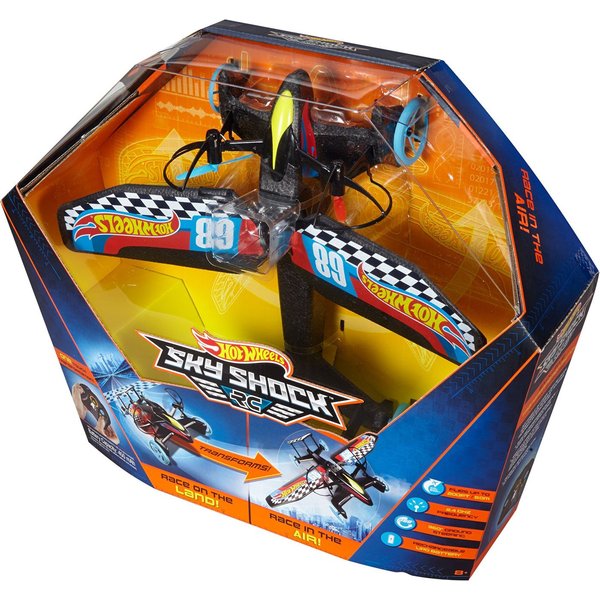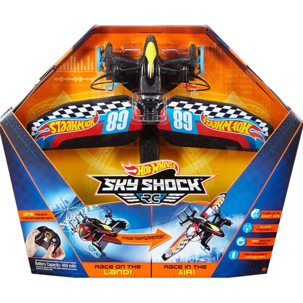 Dzięki odlotowym wyścigówkom Sky Shock marki Hot Wheels Twoje wyścigi nie muszą się już ograniczać do trasy po lądzie. Teraz Twój pojazd może wzbić się w powietrze i wykonywać różne podniebne akrobacje. Dzięki specjalnej konstrukcji i niezwykle lekkim materiałom Sky Shock może osiągać wysokość nawet 60 metrów!