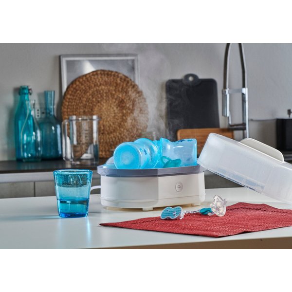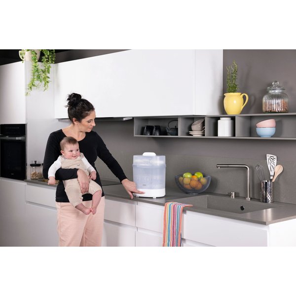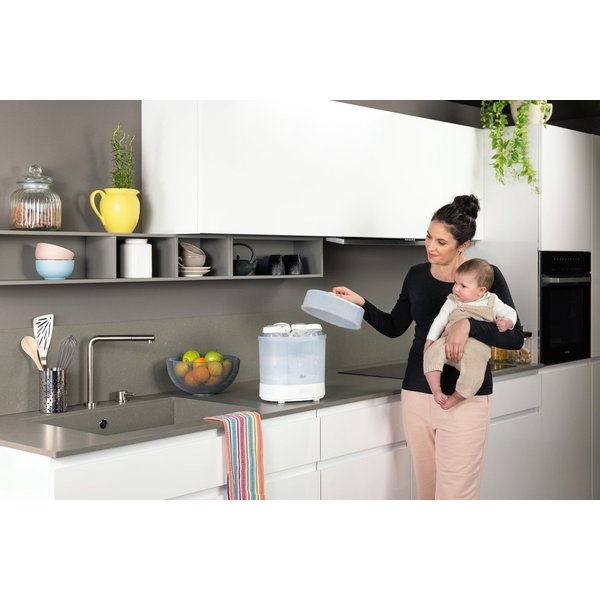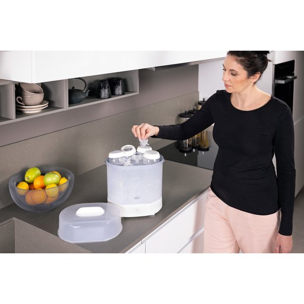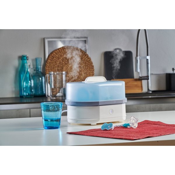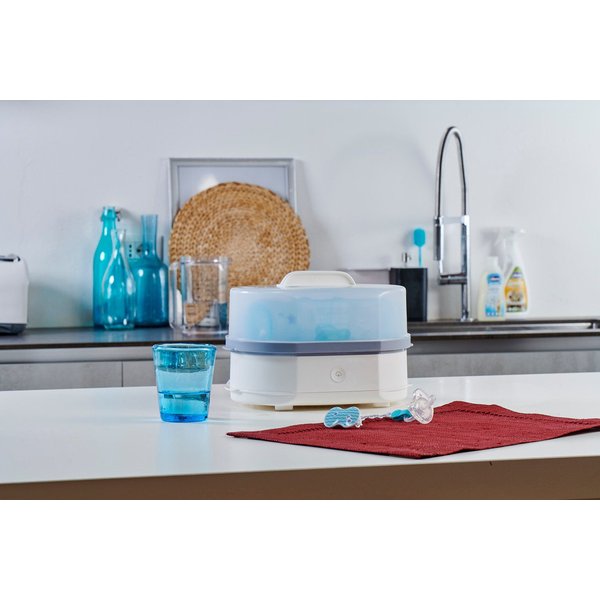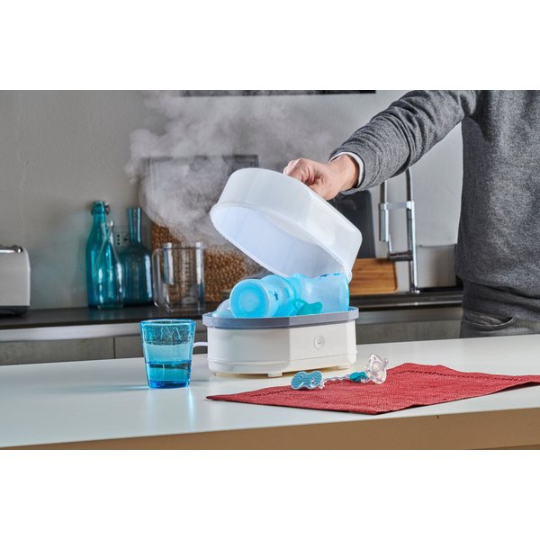 Urządzenie to pozwala na bardzo szybką (zaledwie 5 minut!) sterylizację butelek, smoczków i innych akcesoriów dziecięcych. W efektywny sposób pozbędziesz się szkodliwych bakterii i zapobiegniesz rozwojowi pleśni. Model ten posiada 3 różne konfiguracje, w zależności od Twoich preferencji i aktualnych potrzeb. Możesz używać go w wersji pełnowymiarowej, kompaktowej lub włożyć do mikrofalówki. Ceramiczna powłoka urządzenia ułatwi Ci jego wyczyszczenie, a funkcja 24-godzinnej ochrony nie dopuści do zabrudzenia i skażenia zdezynfekowanych akcesoriów, pod warunkiem utrzymania zamkniętej pokrywy. Sterylizator pomieści aż 6 butelek. Jego praca jest cicha, dzięki czemu możesz go włączyć także w nocy. Po zakończeniu sterylizacji urządzenie wyłączy się automatycznie, dzięki czemu nie musisz się martwić bezpieczeństwem.