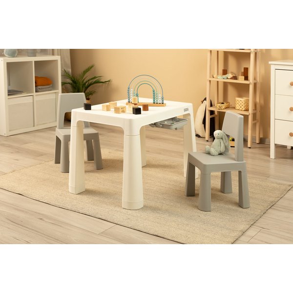 Stolik dziecięcy do ogrodu, pokoju Monti Toyz by Caretero to wszechstronny mebel, który zapewni dziecku wiele korzyści. Wykonany z wysokiej jakości tworzywa sztucznego, stolik i krzesełka są bezpieczne i odporne na trudne warunki pogodowe oraz intensywną zabawę. Duża powierzchnia blatu o wymiarach 77x50 cm zapewnia dużo miejsca do pracy artystycznej i zabawy. Stolik posiada również 2 chowane szuflady, idealne do przechowywania przyborów. Dodatkowo, możliwość obniżenia wysokości o 6 cm sprawia, że stolik jest jeszcze bardziej funkcjonalny. Prosta konstrukcja i lekka waga umożliwiają łatwe przenoszenie zestawu. Solidna konstrukcja i wysokiej jakości materiały zapewniają długowieczność produktu. Stolik Monti Toyz Caretero to idealny wybór dla dziecka od 3 lat.