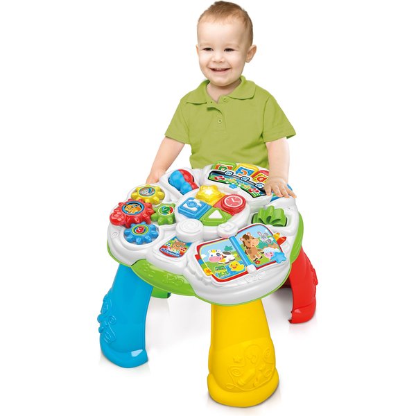 Stolik posiada mnóstwo atrakcji dla twojego maluszka. Jest tu książeczka ze zwierzątkami, pianinko, kręcące koła zębate i kolorowe przyciski o różnych kształtach do wciskania - zabawa nie będzie miała końca!