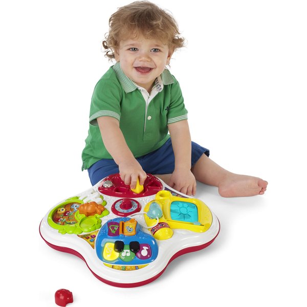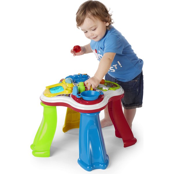 Każdy z czterech rogów stolika kryje inne niespodzianki. Kolorowe pianinko nauczy maluszka pierwszych cyfr, a przewracając strony mini książeczki zapozna z nazwami instrumentów muzycznych. W ogródku czekają wesołe warzywa, które wprowadzą malucha w świat kolorów. Jest tu także kuchenka z garnkiem i przyprawami pełna realistycznych dźwięków i odgłosów. Czas na kreatywną zabawę! Znikopis już czeka, aż maluch stworzy swoje pierwsze dzieło za pomocą dołączonego długopisu. Rysunek łatwo się zmywa, wystarczy przeciągną suwak i zabawę można rozpocząć od nowa.