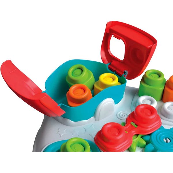 Uwagę dziecka przyciągnie też katapulta i młotek, umożliwiające skoki kolorowym klockom. Jest jeszcze karuzela z kółkami zębatymi. Nogi stolika posiadają wgłębienia, w których mogą się chować miękkie Clemmy oraz książeczka typu pop-it.