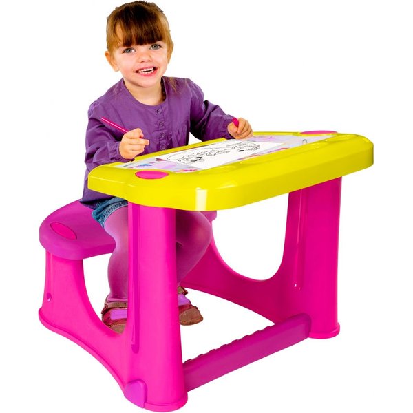 Każdy maluszek marzy o własnym kąciku - osobiste biurko to idealne miejsce do zabawy i nauki. Stolik połączony jest z wygodną ławeczką, na której maluszek może siedzieć podczas wykonywania przeróżnych czynności. Ponadto stoliczek może być używany zarówno w domu, jak i na dworze, co daje wiele możliwości zabawy. Został wyposażony w ergonomiczną podstawkę na stopy dziecka, dzięki czemu podczas siedzenia nóżki w pełni odpoczywają.