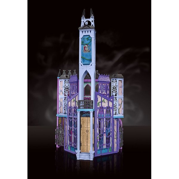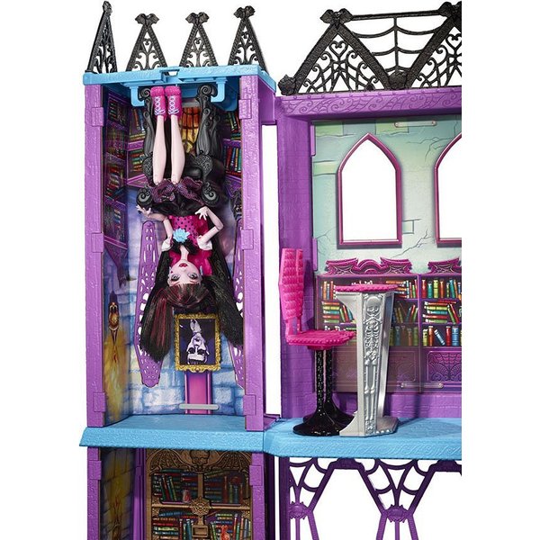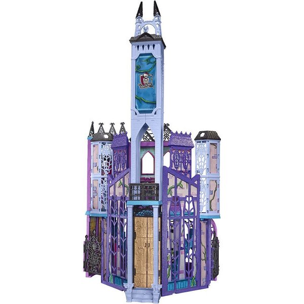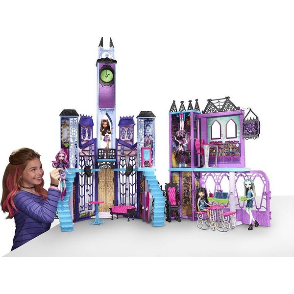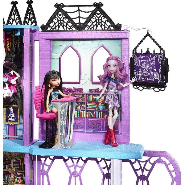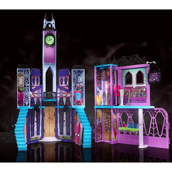 Każda mała miłośniczka bajki Monster High marzy o domku dla swoich ulubionych straszyciółek. Kolorowa szkoła otwiera się, a w środku czeka wiele strasznych niespodzianek! Składa się z parteru i piętra w których znajdziemy 4 oddzielne pomieszczenia. Hall posiada wygodną sofę i stolik przy którym można się zrelaksować po skończonej lekcji. Stołówkę gdziemoże usiąść z przyjaciółmi i zjeść śniadanie. Bibliotekę, a w niej mnóstwo książek i tajemne przejście gdzie jedna z lalek może odpocząć wisząc do góry nogami. Dwa wejścia po schodach, które zaprowadzą Cię prosto na wierzę zegarową wraz z balkonem