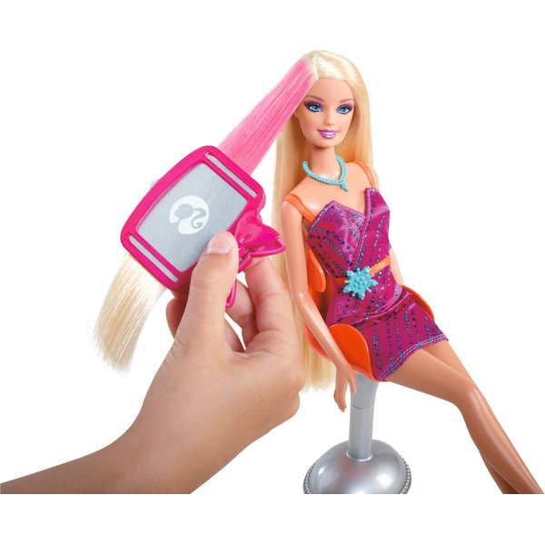 W zestawie mała fryzjerka najdzie wszystko czego potrzebuje, aby zrobić barbie na bóstwo! Tego jeszcze nie było - wystarczy zacisnąć szablon z różnymi kolorami i stworzyć nowoczesną i oryginalną fryzur! Barbie ma bardzo długie włosy, wiec jest na czym pracować. W zestawie znajduje się fotel fryzjerski, na którym można posadzić barbie. Studio z pewnością zachwyci każdą dziewczynkę, zestaw doskonały na prezent!