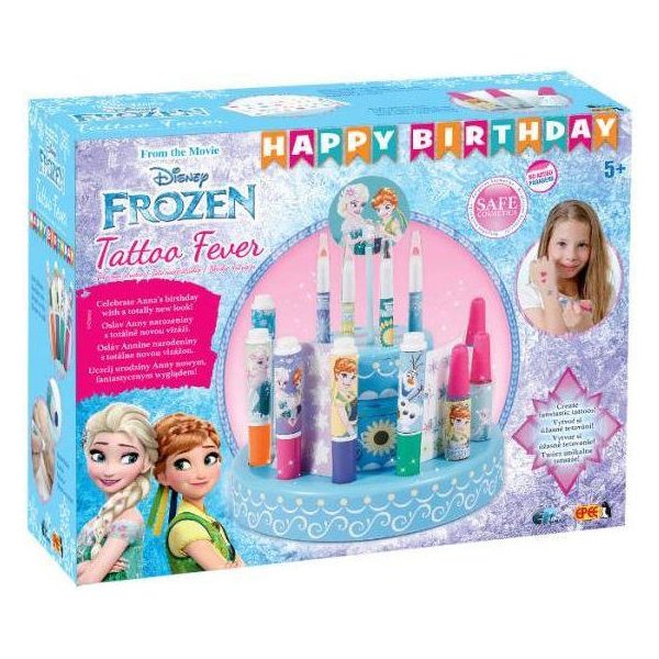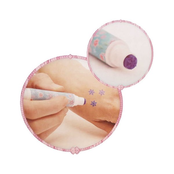 Zestaw Studio tatuażu został wyposażony w niezbędne kosmetyki oraz ozdoby, dzięki którym będziesz błyszczeć jak prawdziwa księżniczka! Znajdziesz tu szablony do malowania na skórze, naklejki do ciała, kredki, markery oraz brokatowe żele do malowania ciała. Wszystkie ozdoby pięknie się mienią i nawiązują do głównych bohaterek bajki: Anny i Elsy.