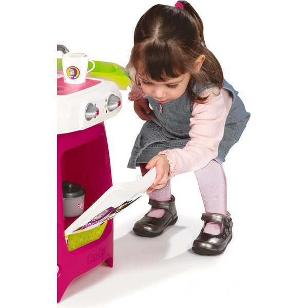 Każdy maluszek uwielbia gotować i przyrządzać wymyślone dania dla swoich zabawek i przyjaciół. Ten ogromny zestaw posiada zarówno przyrządy do gotowania, jak i zastawę do jedzenie dla 2 osób. Jest tu piekarnik i płyta kuchenna z przyciskami do przekręcania, ekspres do napojów na kapsułki, zlew, patelnia, garnek, solniczka, łopatka do gotowania i wiele więcej!