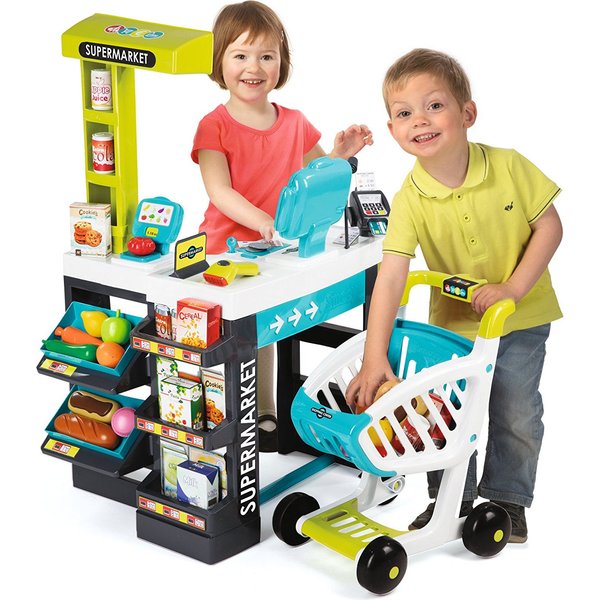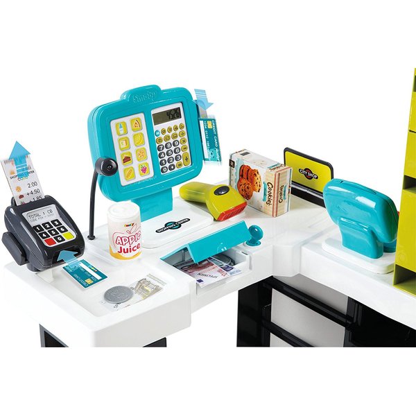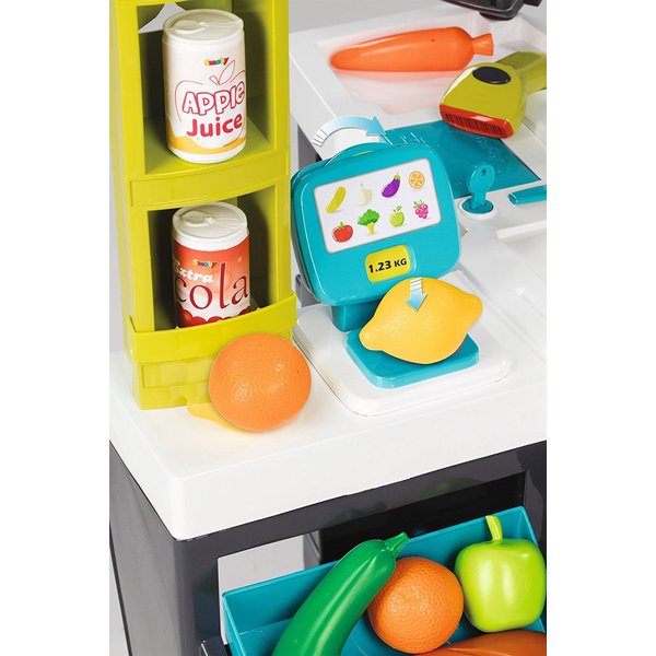 Wielki supermarket to idealna zabawka dla przyszłych sprzedawców! Każde dziecko uwielbia odtwarzać sytuacje z życia codziennego dorosłych osób jedną z nich są codzienne zakupy, dzięki Supermarketowi teraz jest to możliwe! Sklep został wyposażony w kasę z elektroniczny kalkulatorem, wagę oraz terminal do płatności kartą, znajdziemy również imitację sklepowego asortymentu. Ponadto zakupione produkty można skasować przy pomocy czytnika, który świeci i wydaje dźwięk - szykuje się super zabawa! Zestaw zawiera zabawkowe pieniążki w walucie Euro. Zabawa w odgrywanie ról będzie rozwijać wyobraźnię dziecka.
