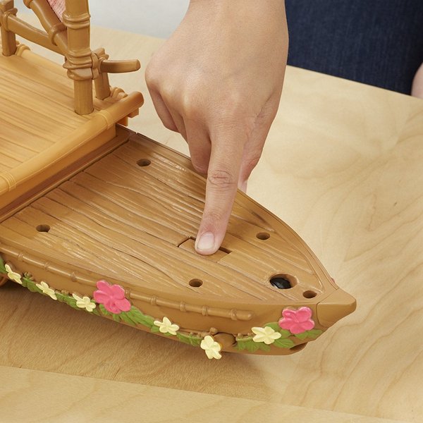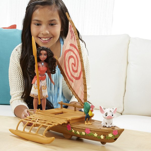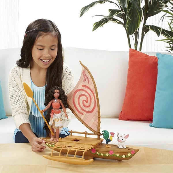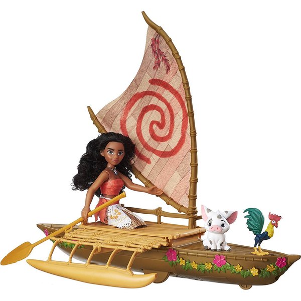 Vaiana wyrusza w podróż na swoim kajaku wraz z dwoma przeuroczymi zwierzątkami świnką i kogutem - wyglądają dokładnie jak w bajce! W łódce kryje się niespodzianka - projektor z efektami świetlnymi! Dzięki ruchomym górnym kończynom zabawa stanie się jeszcze ciekawsza.